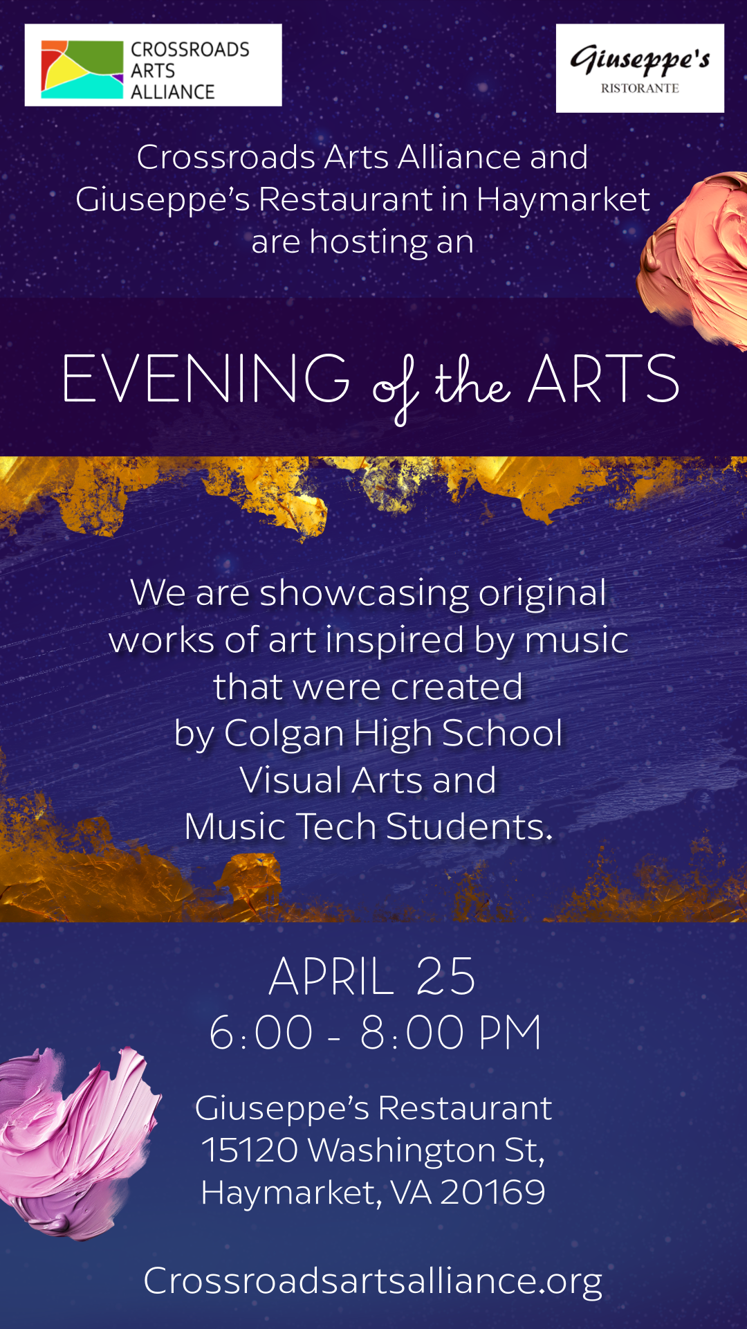Crossroads Arts Alliance is an all-volunteer, 501 (c)(3) non-profit, that was founded in September 2023 to create a larger and thriving arts presence in Haymarket, Gainesville, Bristow, and the surrounding areas. Our mission is to cultivate the historic Crossroads communities by providing experiences in the arts that inspire, engage, educate, and entertain.